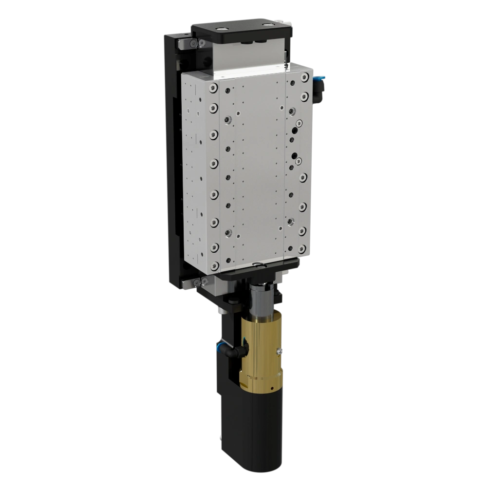 紧凑的设计、良好的承载能力和极高的定位精度是直线轴 EZ-2352-094V 的突出特点。该气浮轴专为负载高达 100 N 的中小行程而设计。带空气轴承的气缸起静态平衡作用。硬涂层铝制滑块由无铁同步电机(Tecnotion UM6)驱动。预紧由磁铁组实现。轴的标准型号配备了海德汉公司的绝对测量系统(LIC 4)。直线轴的行程为 20/40/60 mm,也可根据要求提供其他长度的轴,还可配置横向布置的平衡气缸。两个轴可以叠放在一起,实现简单的十字工作台。